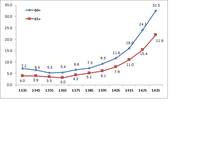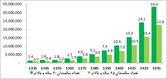 در سال 1395، کمتر از 10 درصد جمعیت ایران را سالمندان 60 ساله و بالاتر تشکیل داده است اما این نسبت در سال 1435 به 32 درصد می­رسد. برای جمعیت سالمندان 65 ساله و بالاتر نیز این نسبت از 6 به 22 درصد طی دوره 1395 تا 1435 افزایش خواهد یافت