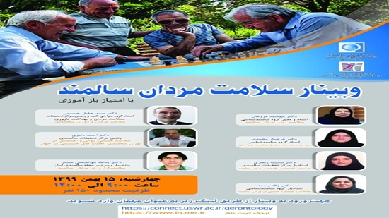 وبینار سلامت مردان سالمند (با امتیاز بازآموزی) توسط مرکز تحقیقات سالمندی با همکاری مرکز تحقیقات سلامت مردان و بهداشت باروری در تاریخ چهارشنبه 15 بهمن برگزار شد.